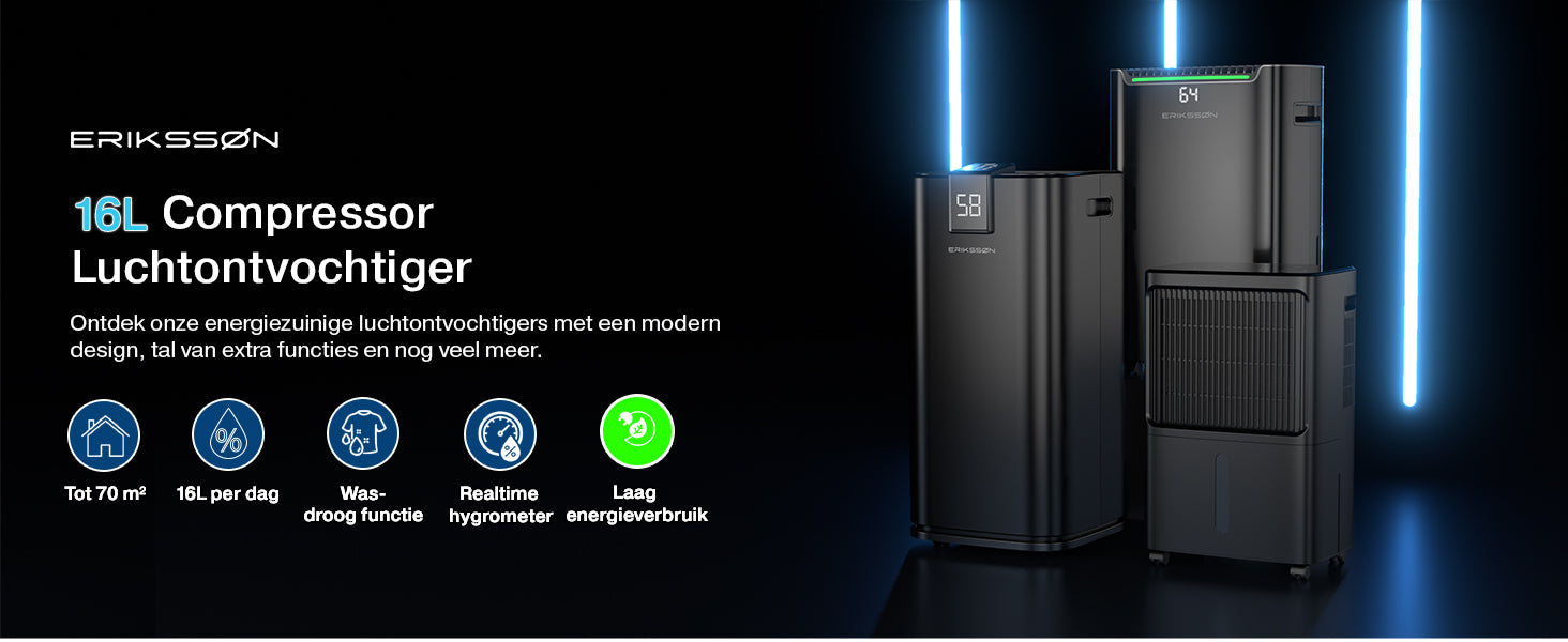 Wil jij vochtproblemen en muffe geurtjes in huis verhelpen, pollen in huis verminderen of simpelweg in het juiste luchtvochtigheidspercentage leven? Dan is de Erikssøn Luchtontvochtiger Dry Pro Plus perfect geschikt voor jou!