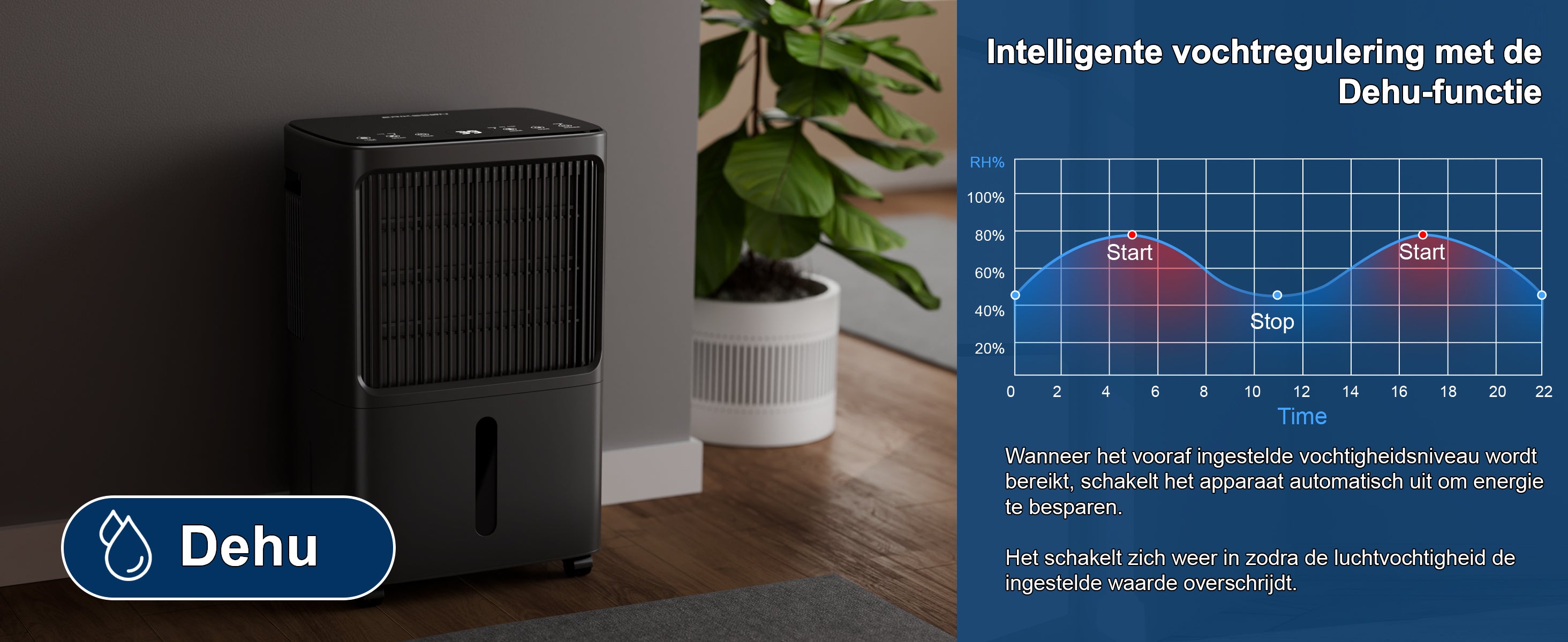 Een luchtontvochtiger helpt bij het verbeteren van de luchtkwaliteit in een binnenklimaat. Vooral in het geval van vocht- en allergie problemen. Het kan schimmel, huisstofmijt en andere allergenen helpen verminderen door de luchtvochtigheid te verlagen. Met de real-time Hygrometer weet je zeker dat jouw kamer een gezond vochtigheidspercentage heeft.