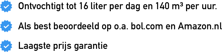 - Ontvochtigt tot 16 liter per dag en 140 m³ per uur.