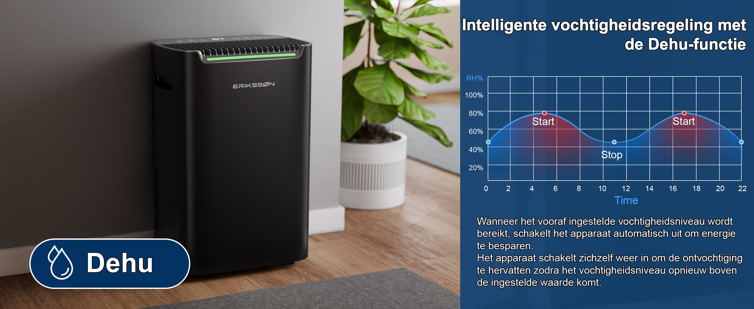 - Met de timer-functie kan jij de Erikssøn luchtontvochtiger tot 24 uur later werken waarna deze automatisch uit gaat. Een energiezuinige oplossing.