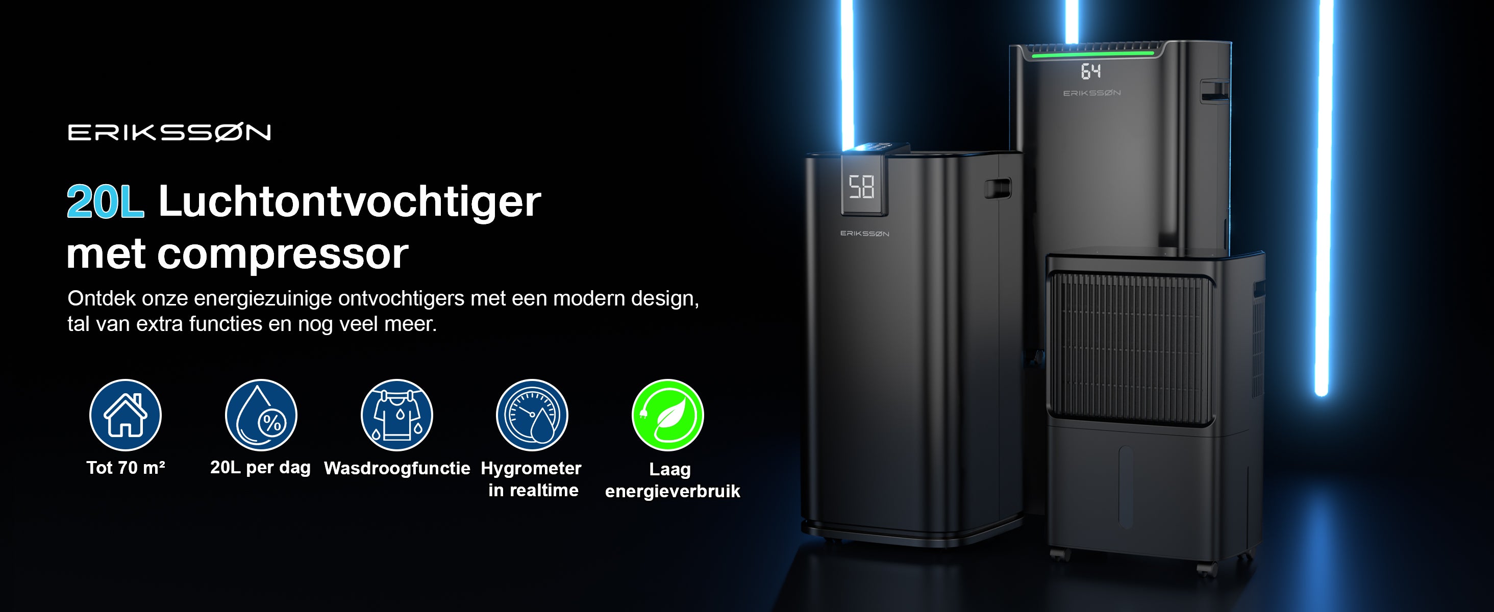 Wil jij vochtproblemen en muffe geurtjes in huis verhelpen, pollen in huis verminderen of simpelweg in het juiste luchtvochtigheidspercentage leven? Dan is de Erikssøn Luchtontvochtiger Dry Pro Plus 20L perfect geschikt voor jou!